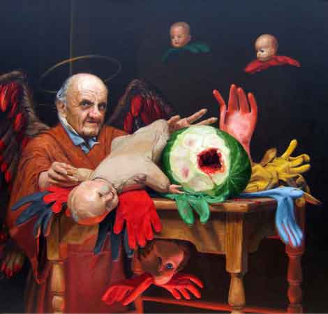 by MIKEL GLASS “Vanitas” is a sub-genre of still life painting in which an artist reflects on the temporal nature of his existence on earth. Though popular several centuries ago, I had the chance to explore this subject with a paint group in New York with which I am involved. I guess the results demonstrate my confusion with the subject. I took as a cue the fact that a vagrant named Freddy who greeted me every morning on the stoop of my studio building, and whose portrait I had painted a couple of times, died at the same time that I was pondering what to paint. I had my angel of death who would be offering my depiction from beyond. Next, dolls and gloves are used metaphorically. While the gloves represent a human presence not depicted, dolls embody all of the hopes and dreams and secrets and aspirations of those who cherished them. Finally, I incorporated the watermelon, an image I had been exploring for some time as a metaphor for man’s attempts to conquer nature. I had not intended to depict it with a ghastly hole that has been variously described by friends as looking anywhere from an open wound to an angry vagina. The truth is that one facet cut from the rind of the fruit ruptured after the watermelon sat decomposing from within during a couple of weeks in my overheated studio. The result was a jet like propulsion of red, viscous watermelon sludge that ended the painting. |