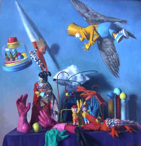 by MIKEL GLASS “I Once Was Lost” is a self-portrait using toys as metaphors to represent the artist as well as other people and events in his life. The bright colors are meant to suggest a happy facade while an exploration of the content in the circular movement of the composition reveals a cycle beginning with turmoil and ending in discovery and freedom. Bart Simpson represents the artist in both early and later life, while the plastic “Willie Wee Wee” toy and the paint roller and rubber ball of the same colors show him in adolescence and early manhood. |